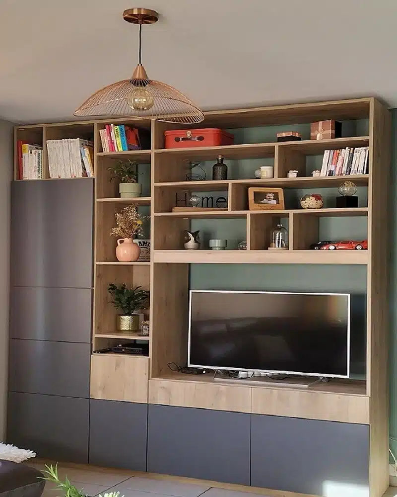 Vous avez également la possibilité d’enlever le fond dans le cas ou votre bibliothèque sur mesure ou meuble de rangement sur mesure est une séparation de deux pièces afin de pouvoir tourner la TV sur les deux faces ! astucieux non ?