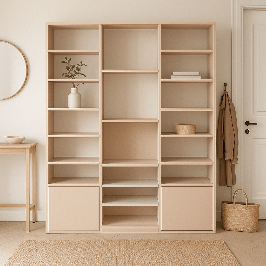 Structure : Étagères ouvertes, niches fermées (portes ou tiroirs en option)