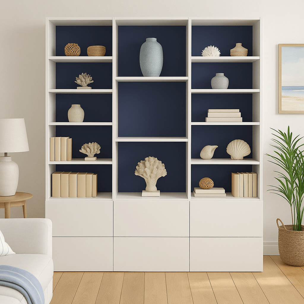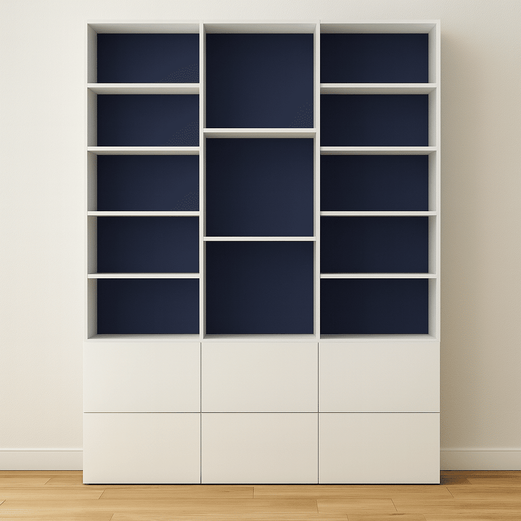 Ses trois rangées proposent un bel équilibre entre étagères ouvertes, pour mettre en valeur vos livres et objets déco, et tiroirs fermés, parfaits pour organiser documents ou accessoires hors de vue. L’association du blanc lumineux et du bleu (clair, marine ou pastel selon vos préférences) permet de jouer sur les contrastes tout en gardant une esthétique moderne.
