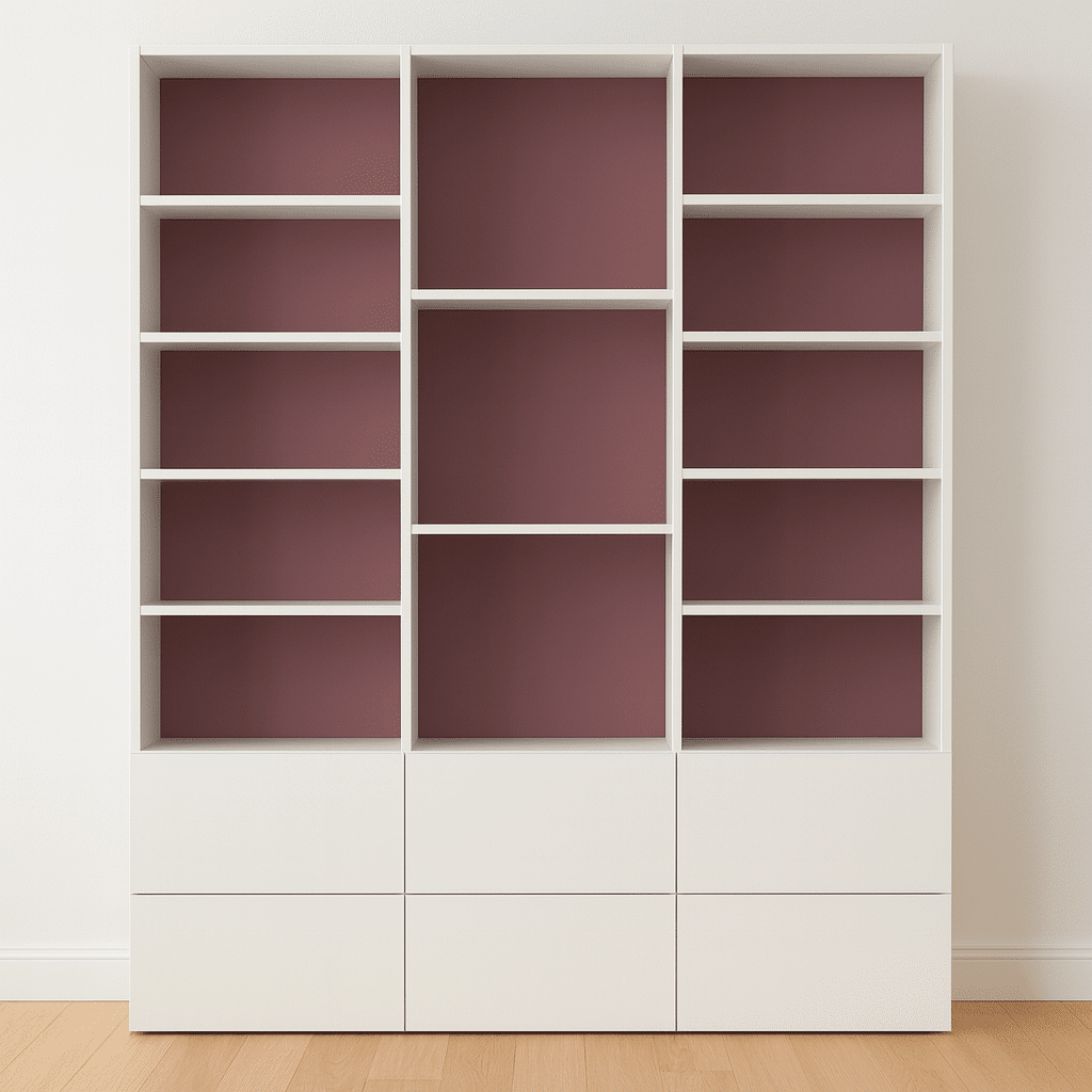 Bibliothèque sur mesure trois rangées avec étagères et tiroirs – Blanche et bordeaux