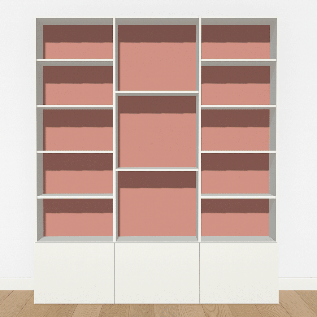 Bibliothèque sur mesure trois rangées avec étagères et tiroirs : Blanche et rose