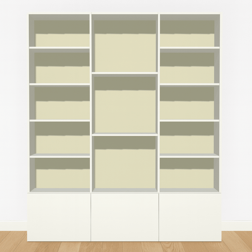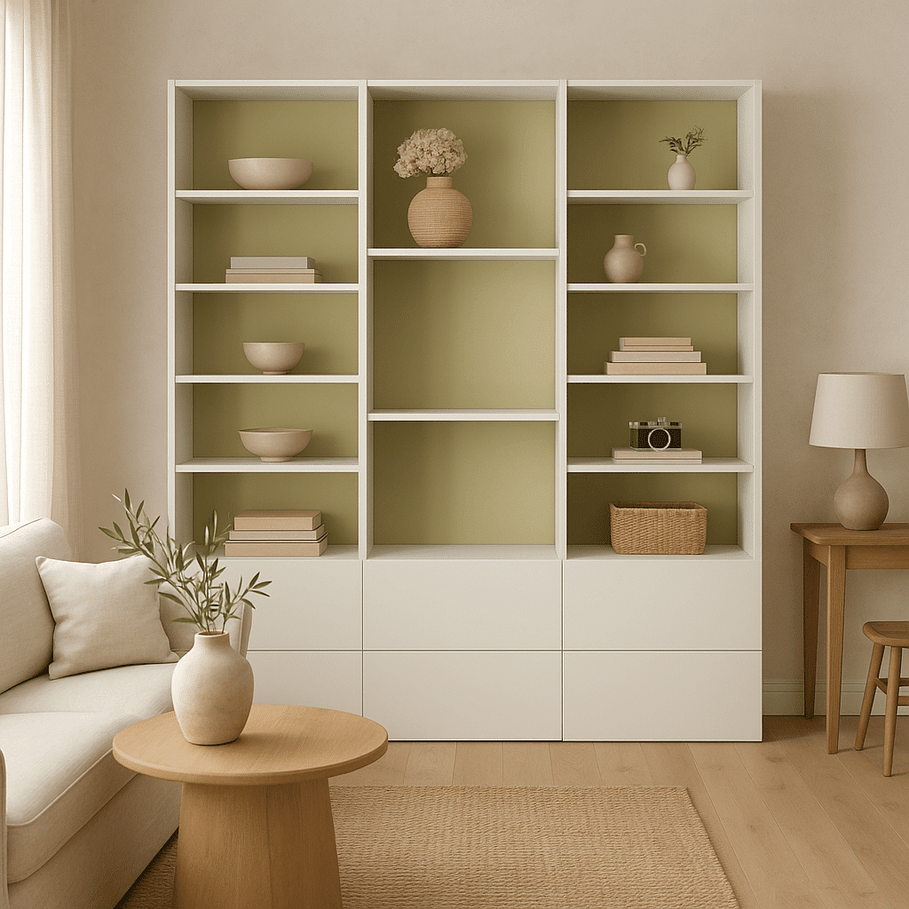 Avec ses trois rangées, ce meuble offre un parfait équilibre entre étagères ouvertes pour exposer livres et objets déco, et tiroirs bas pour un rangement discret. Le contraste du blanc lumineux et du vert (sauge, olive, forêt, ou menthe) s’adapte à toutes les ambiances, de la plus naturelle à la plus contemporaine.
