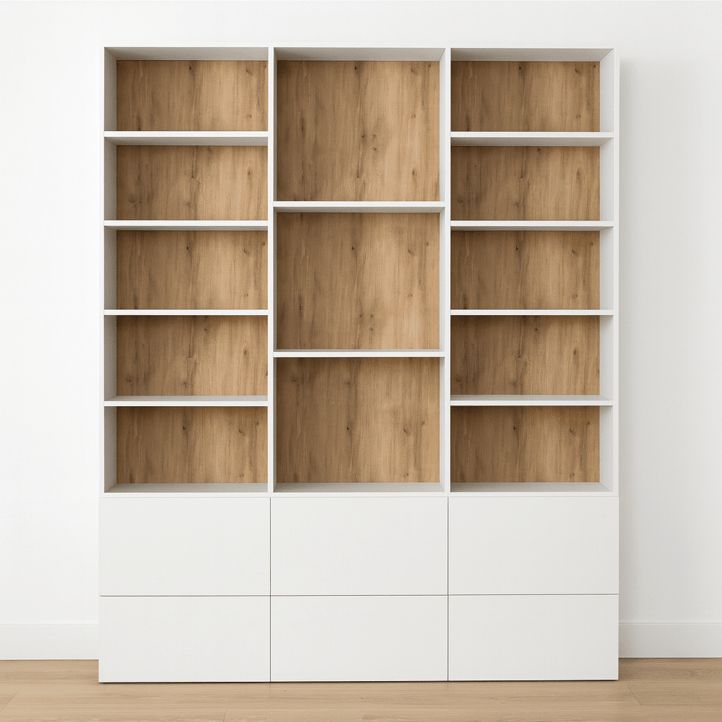 Alliez rangement pratique et esthétique nordique avec cette bibliothèque sur mesure au design scandinave, pensée pour organiser vos livres, objets déco ou accessoires de manière élégante. Avec ses trois rangées, elle propose une belle capacité de rangement, combinant étagères ouvertes pour mettre en valeur et tiroirs intégrés pour garder l’essentiel à portée de main mais hors de vue.