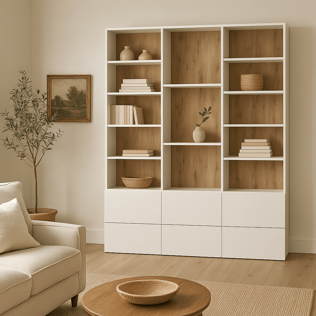 Son style scandinave se distingue par des lignes épurées, une structure en bois clair (ou blanc et bois), et une finition douce et naturelle. Entièrement personnalisable, cette bibliothèque s’adapte à vos dimensions, vos besoins et votre pièce.