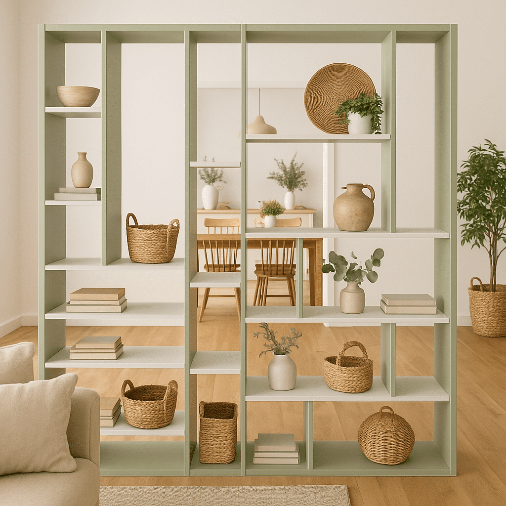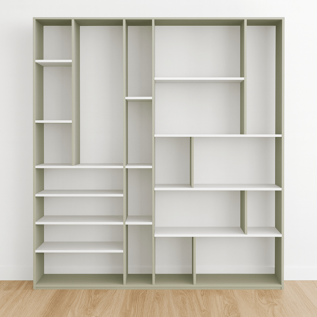 Son design asymétrique et créatif casse les codes traditionnels de la bibliothèque classique. Les niches ouvertes, disposées de manière déstructurée, créent un rythme visuel unique tout en offrant un espace de rangement pratique et structuré.