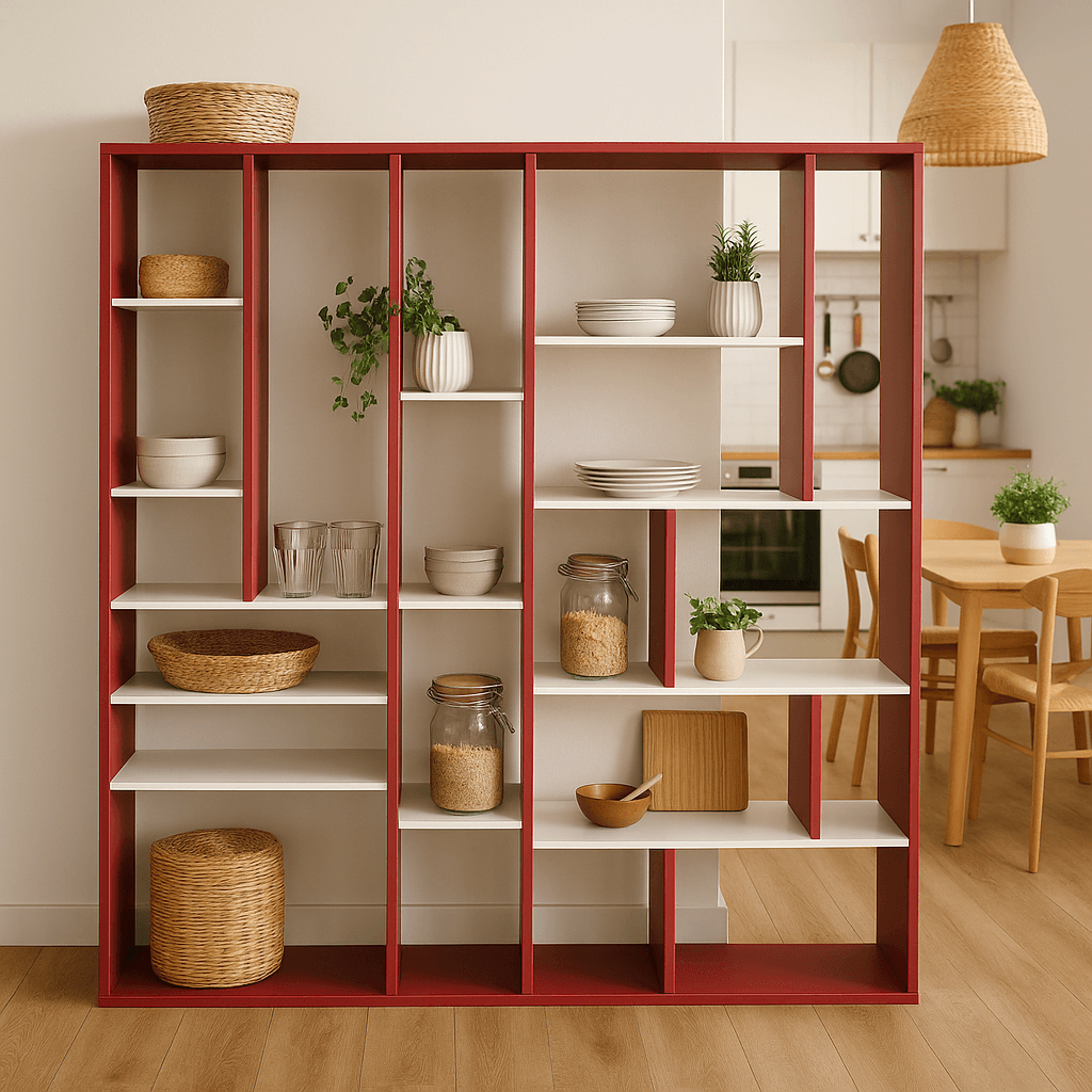 Apportez énergie et modernité à votre intérieur avec cette bibliothèque sur mesure déstructurée rouge et blanche, signée Tikimob.