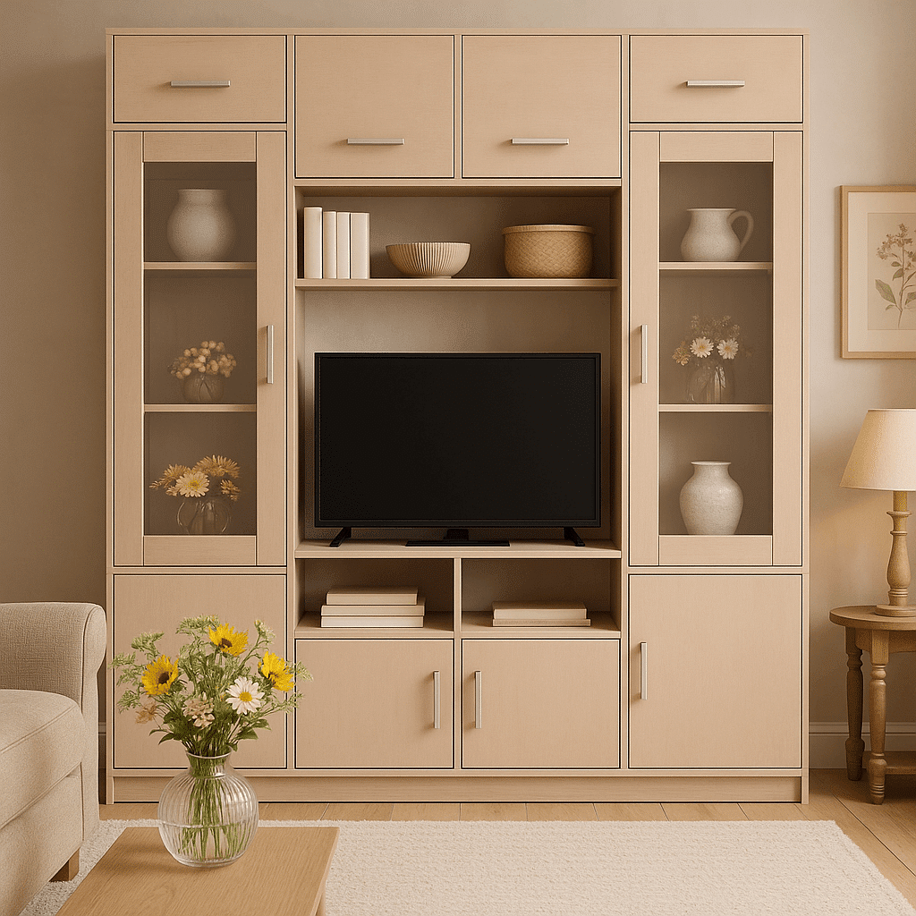 Structure : Espace TV central, colonnes de bibliothèques, niches, placards, tiroirs