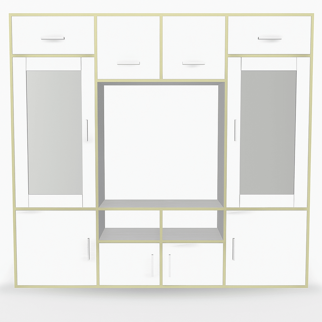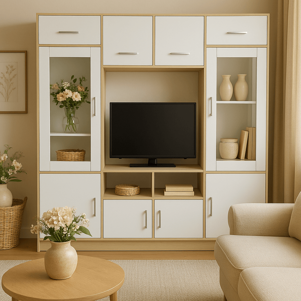 Structure : Espace TV, colonnes, niches ouvertes, placards ou tiroirs