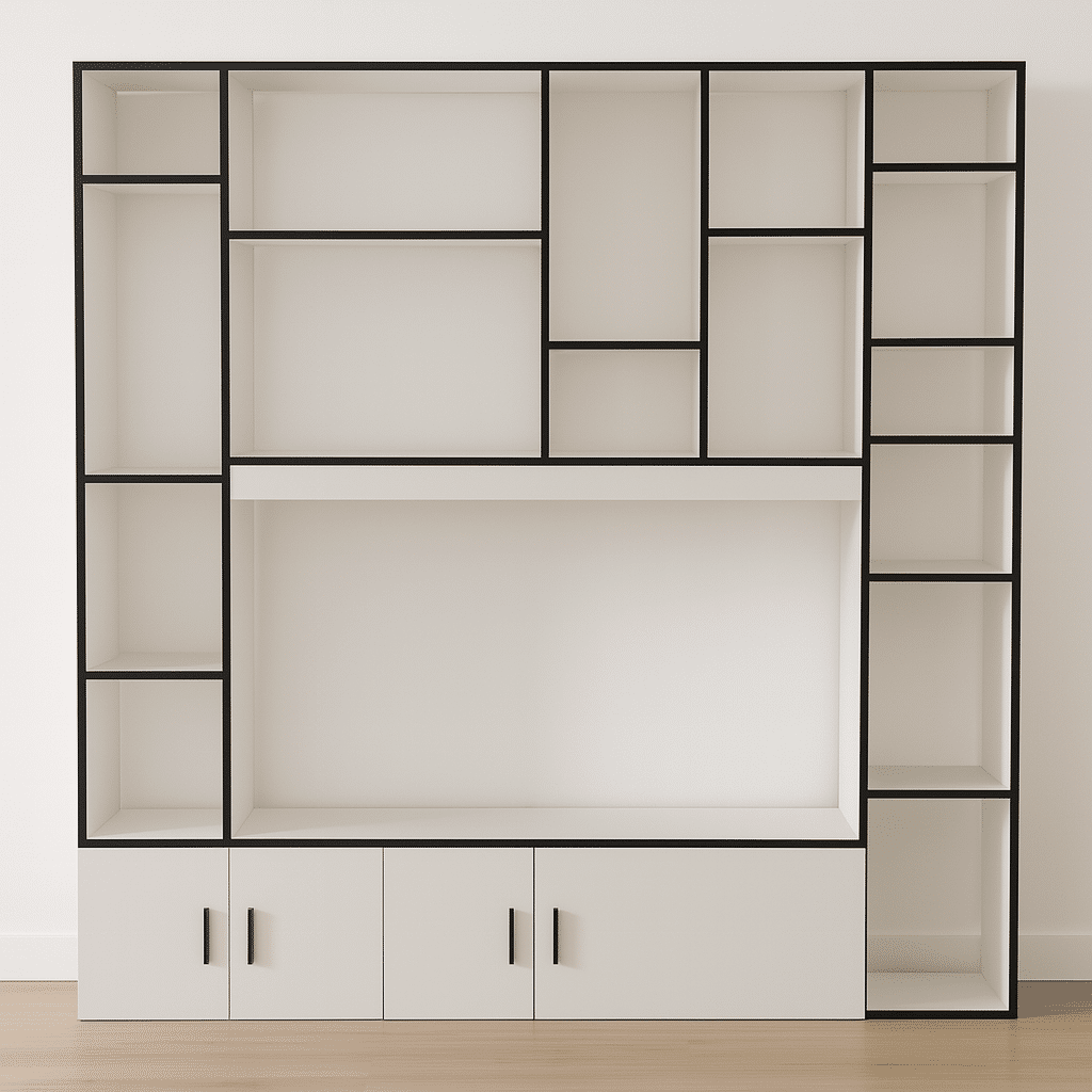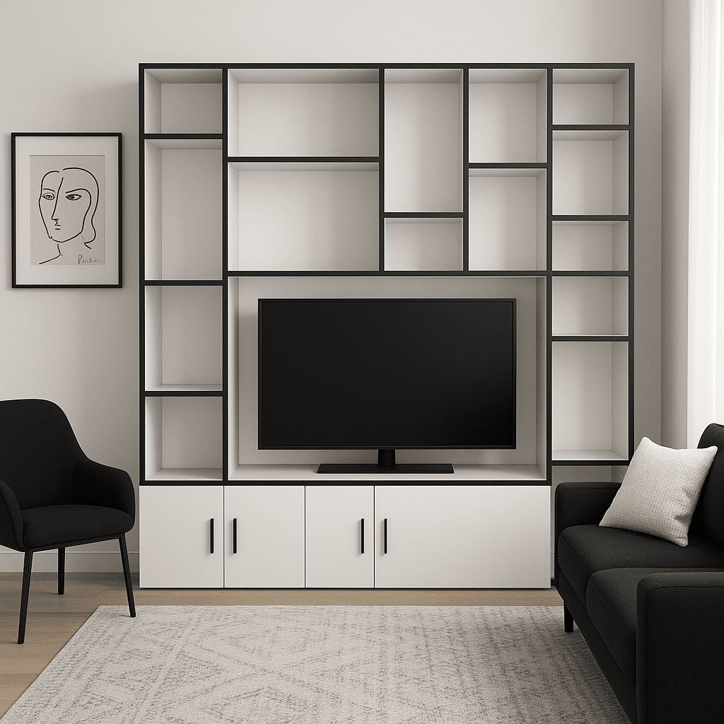 Apportez une touche graphique et contemporaine à votre salon avec ce meuble TV sur mesure blanc et noir signé Tikimob. L’alliance du blanc éclatant et du noir profond crée un contraste moderne, idéal pour structurer visuellement votre espace. Entièrement personnalisable, ce meuble s’adapte à vos besoins en matière de rangement tout en offrant un design résolument épuré et équilibré.