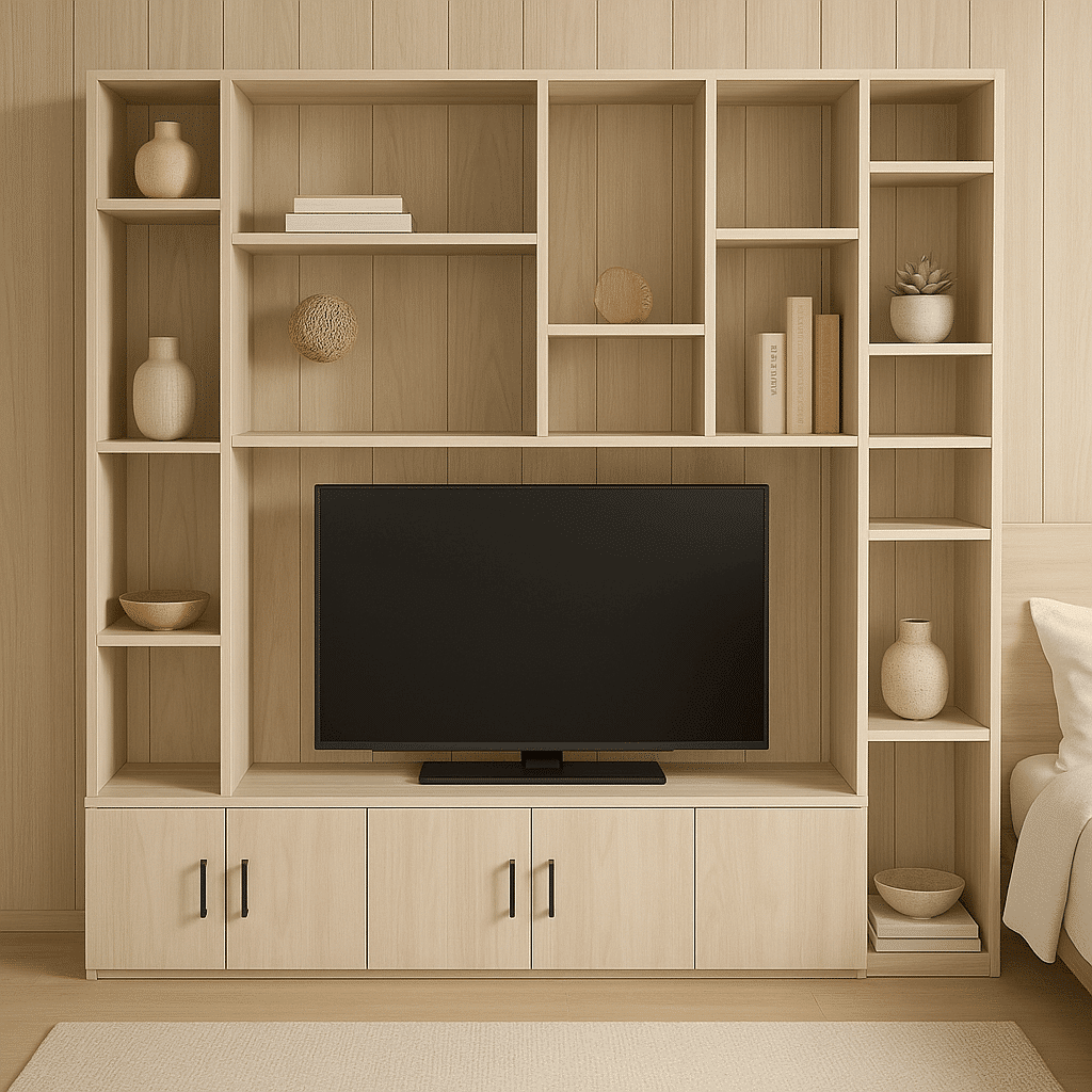 Créez un salon accueillant avec ce meuble TV sur mesure à l’esprit chaleureux, imaginé par Tikimob. Pensé pour conjuguer esthétisme et confort, il utilise des matières et teintes naturelles comme le bois clair, le beige, ou des nuances chaudes pour réchauffer votre espace. Fonctionnel et 100 % personnalisé, il s’intègre harmonieusement dans tous les intérieurs où bien-être et style sont essentiels.