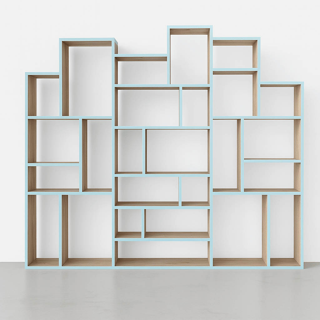 Apportez une touche créative et audacieuse à votre intérieur avec cette bibliothèque destructurée sur mesure en bleu, signée Tikimob. Grâce à un jeu de niches asymétriques, cette pièce mêle design graphique et rangement intelligent. La teinte bleue, apaisante ou vibrante selon le ton choisi (marine, pastel, bleu nuit…), en fait un élément fort de votre décoration, tout en restant pratique pour exposer livres, objets ou souvenirs.