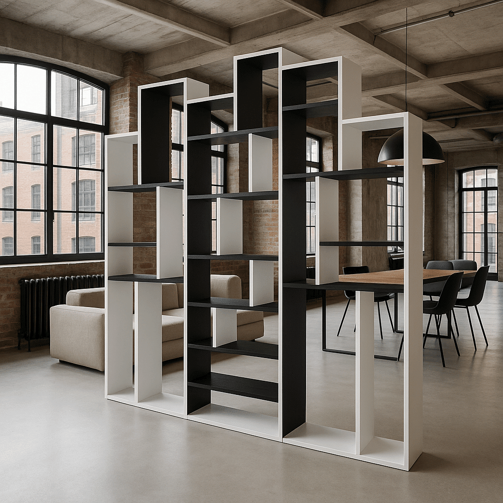 Misez sur un style graphique et intemporel avec cette bibliothèque destructurée noir et blanc, conçue sur mesure par Tikimob. Grâce à l’alternance de niches asymétriques, de modules noirs profonds et blancs lumineux, elle devient un véritable élément déco à part entière. Idéale pour exposer vos livres, objets design ou souvenirs, elle s’adapte aussi bien à un salon contemporain qu’à un bureau élégant.