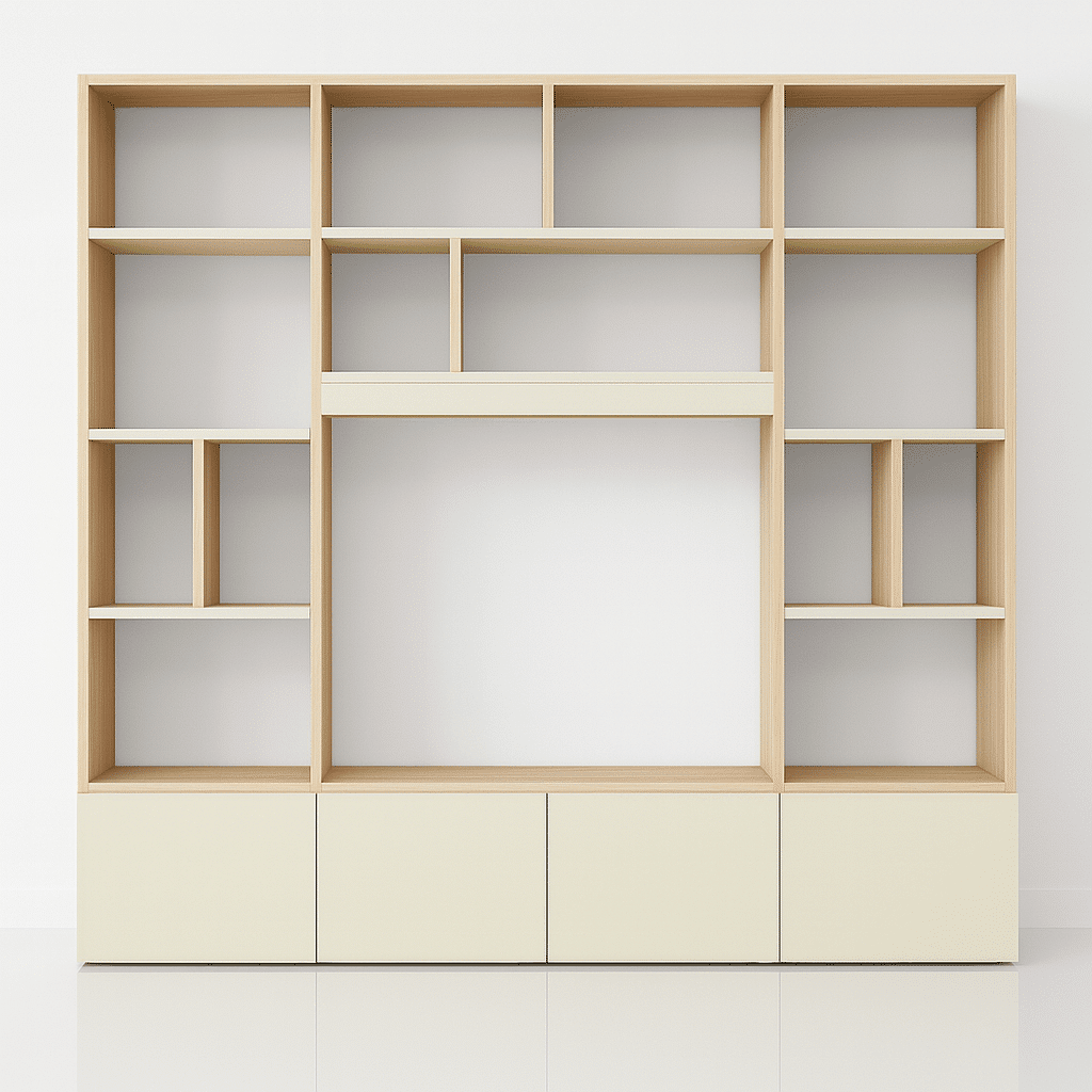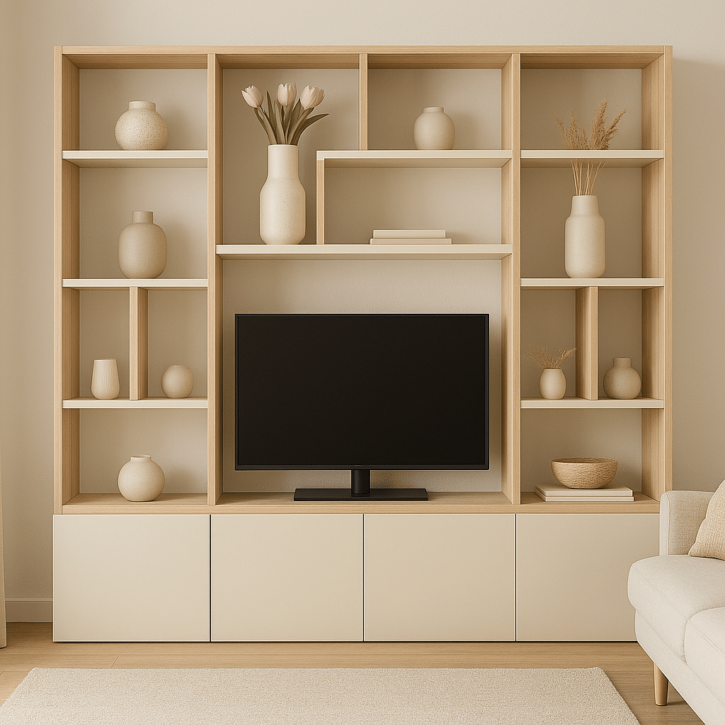 Structurez votre salon avec style grâce à ce grand meuble TV bibliothèque blanc conçu sur mesure par Tikimob. Véritable pièce centrale de votre aménagement, il associe un espace multimédia optimisé à de nombreux rangements ouverts et fermés. Sa finition blanche, sobre et lumineuse, s’intègre dans tous les intérieurs et permet de valoriser vos objets déco, livres ou équipements électroniques avec élégance.