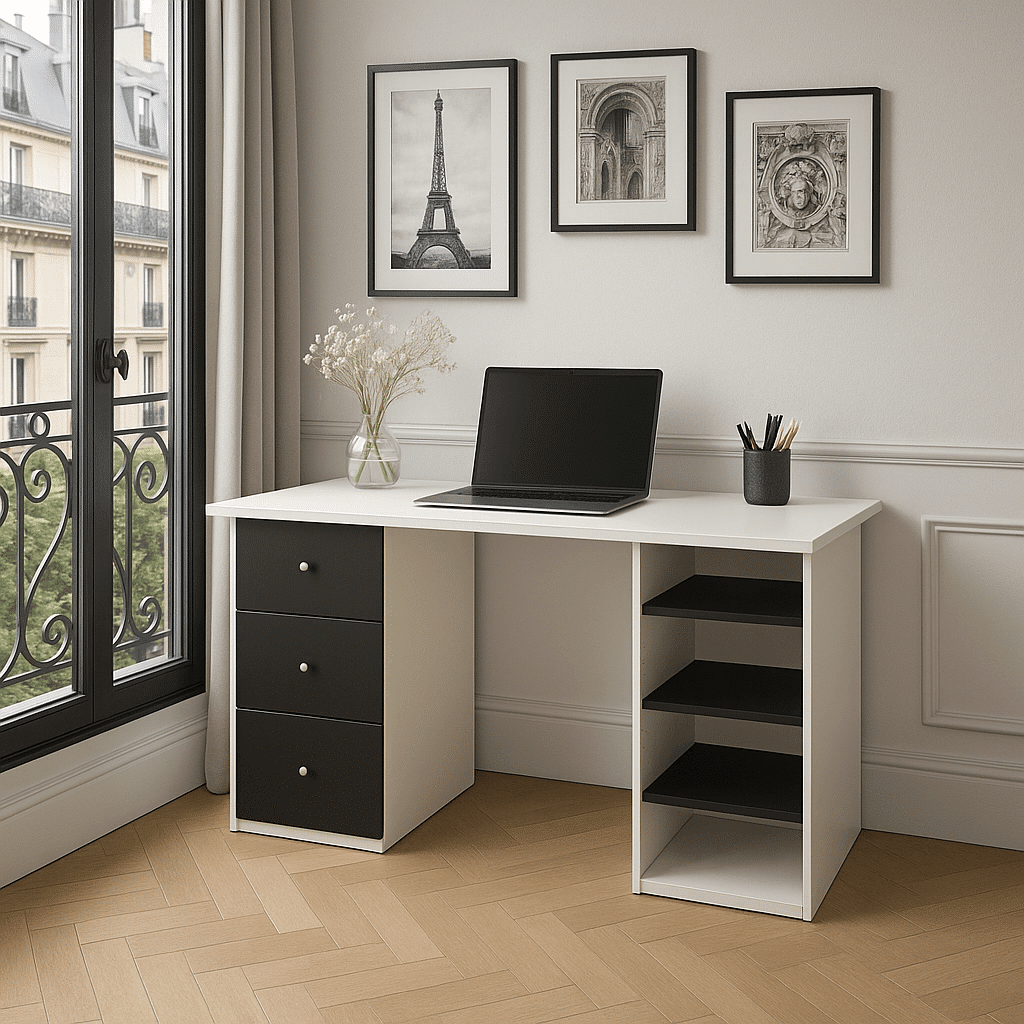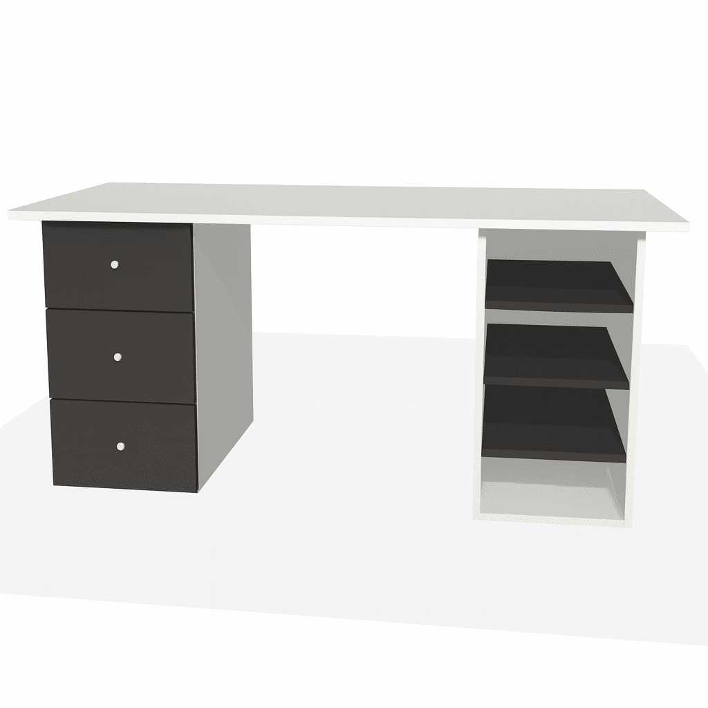 Structure : Plateau principal bicolore + caisson intégré + étagère murale ou intégrée