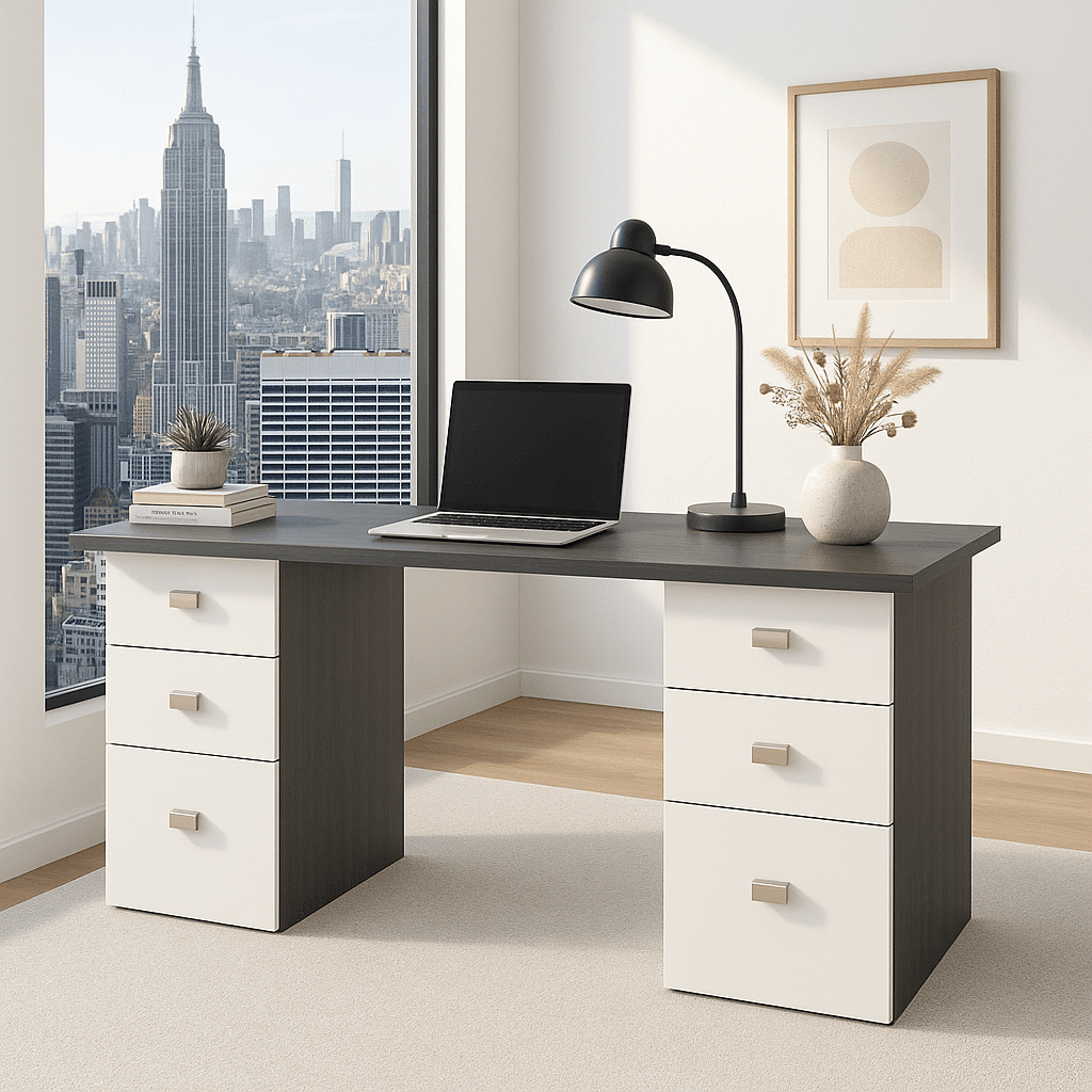 Apportez équilibre et style à votre espace de travail avec ce bureau sur mesure blanc et gris à double caisson, imaginé par Tikimob. Mariant la sobriété du gris à la pureté du blanc, ce bureau offre une esthétique contemporaine, idéale pour un cadre professionnel ou un bureau à domicile. Ses deux caissons intégrés permettent de garder tous vos essentiels à portée de main, tout en préservant une organisation impeccable.
