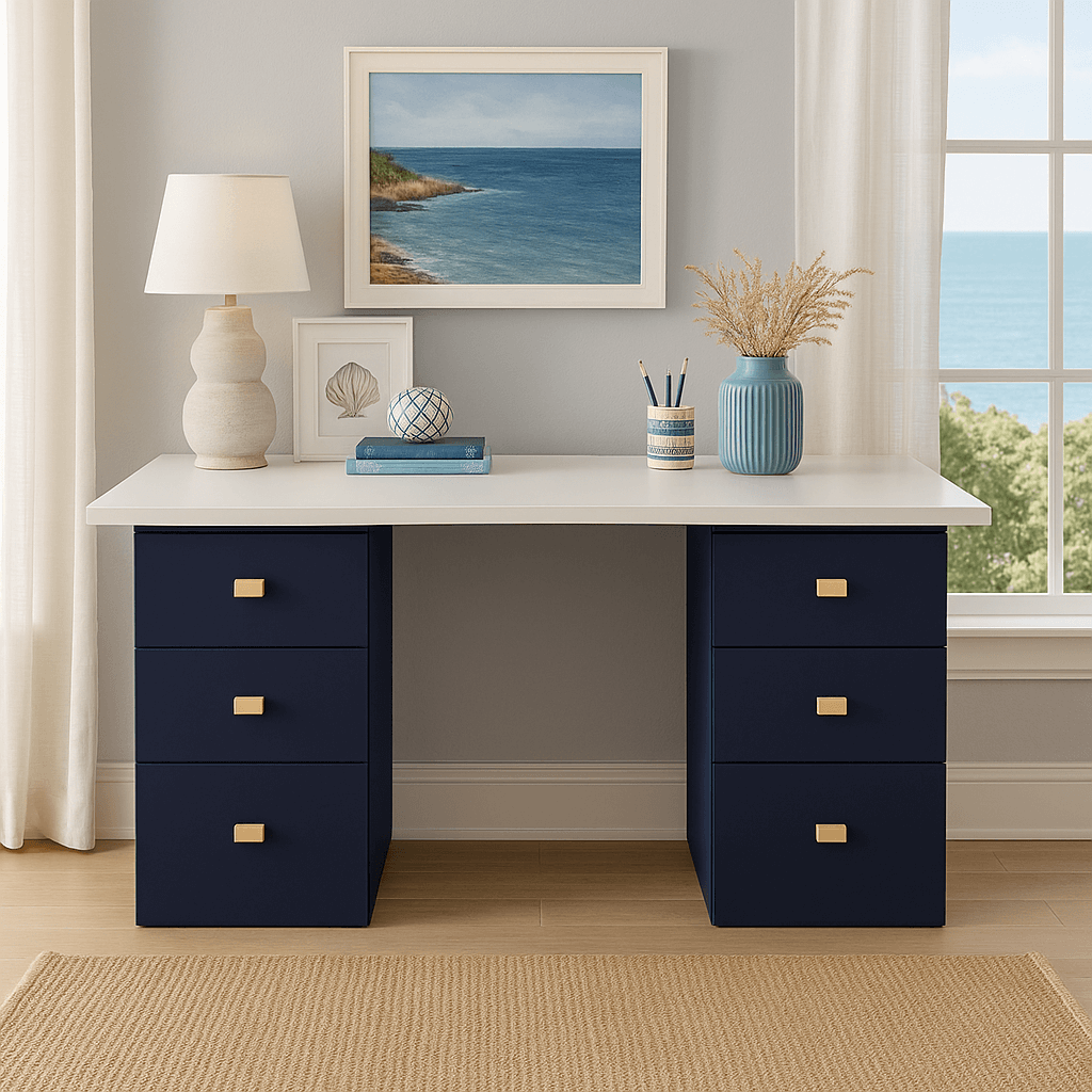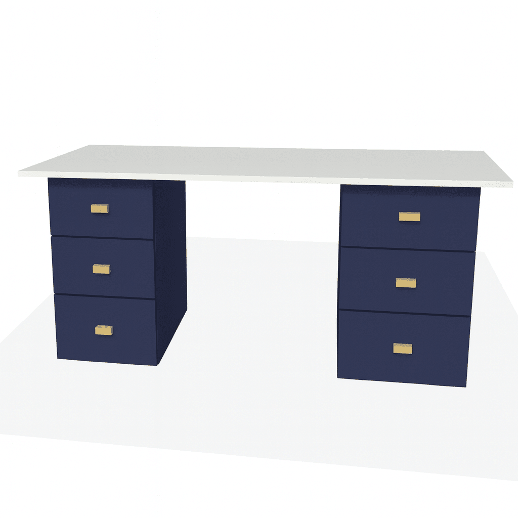 Apportez clarté et originalité à votre espace de travail avec ce bureau sur mesure bleu et blanc à double caisson, imaginé par Tikimob. L’alliance du bleu (clair, pastel ou marine) et du blanc crée une atmosphère à la fois douce et dynamique, idéale pour favoriser la concentration. Grâce à ses deux caissons intégrés, ce bureau offre une grande capacité de rangement tout en maintenant un style épuré.