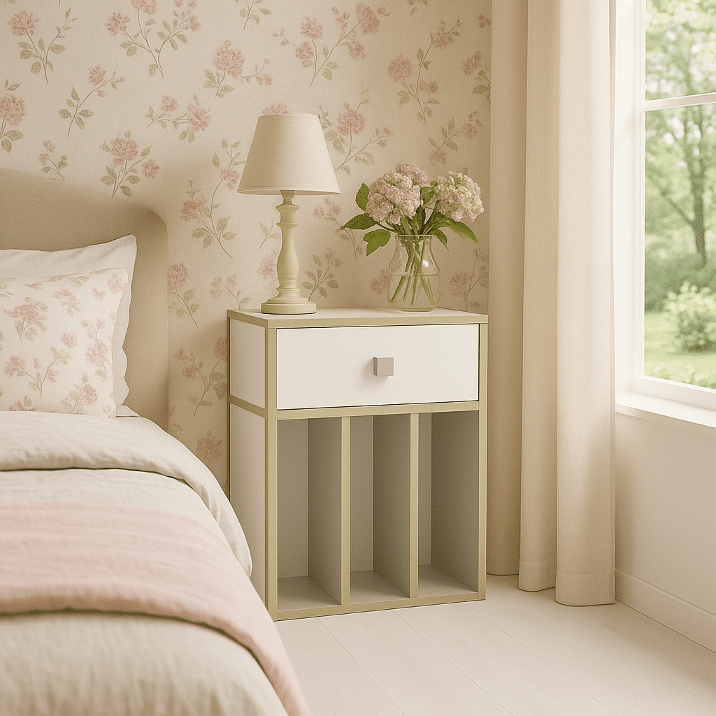 Table de chevet sur mesure avec étagères verticales – Vert et blanc