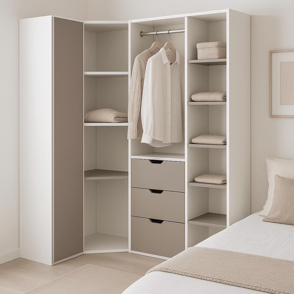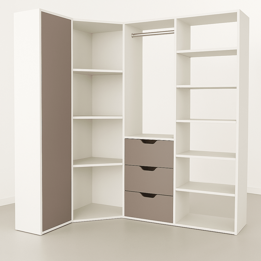 Structure : Modules d’angle, penderies, étagères, tiroirs, niches ouvertes ou fermées