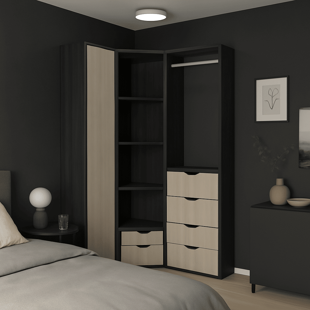 Transformez votre coin dressing en un espace fonctionnel et sophistiqué avec ce dressing en angle sur mesure noir, imaginé par Tikimob. Parfait pour exploiter au mieux les angles d’une chambre ou d’un dressing fermé, il allie esthétisme contemporain et optimisation maximale du rangement. Sa finition noire mate ou satinée lui confère un style audacieux et élégant, parfaitement adapté aux intérieurs modernes.