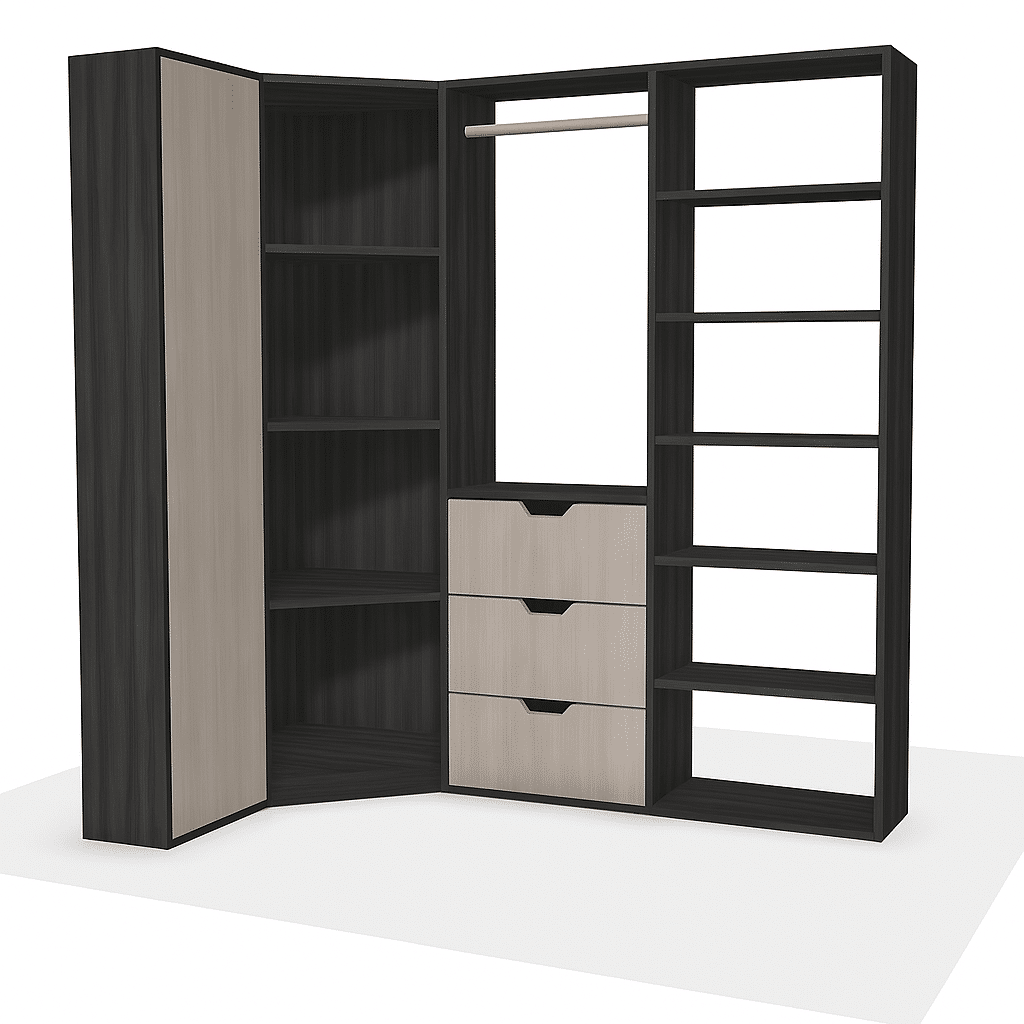 Structure : Modules d’angle, penderies, étagères, tiroirs, colonnes hautes