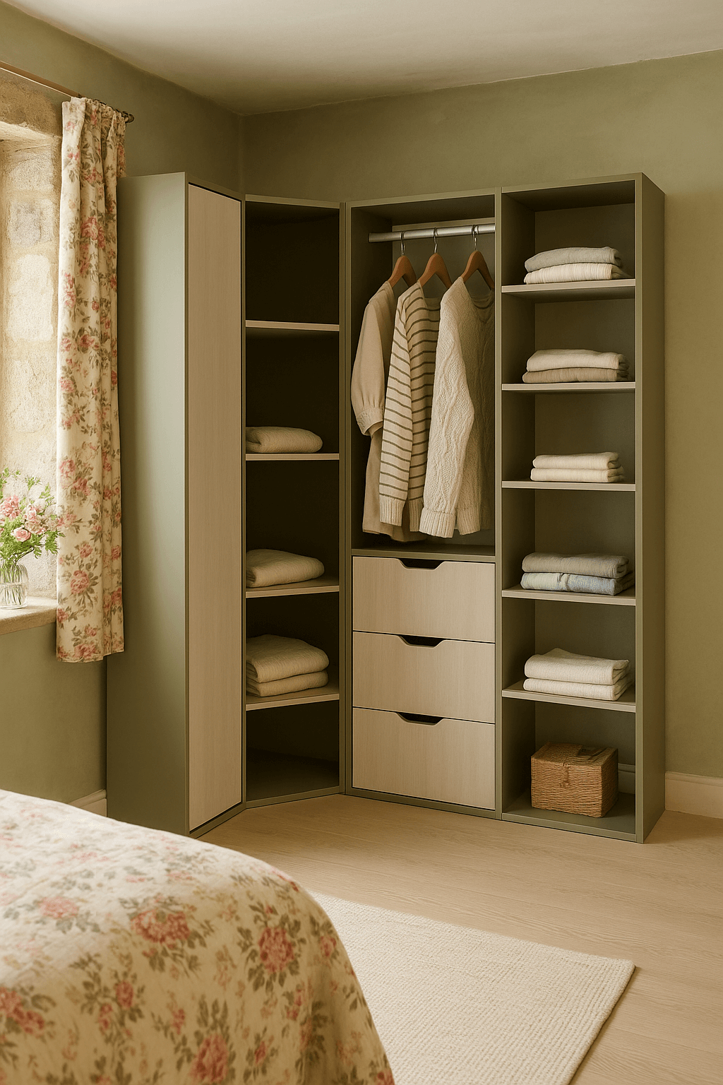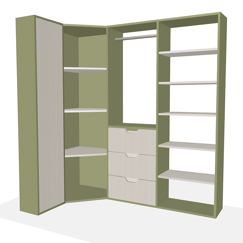 Structure : Penderies, étagères, tiroirs, modules d’angle, niches