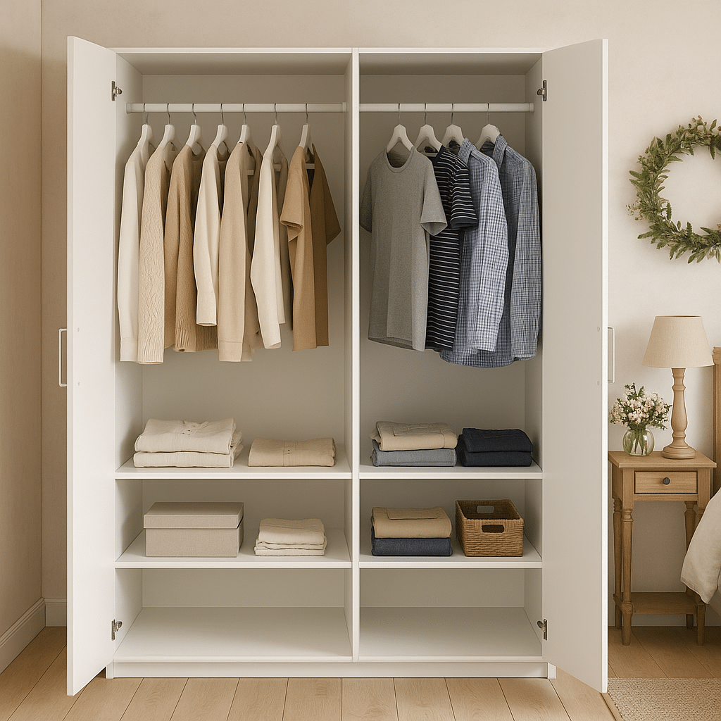 Structure : Portes battantes ou coulissantes, penderie, étagères, tiroirs