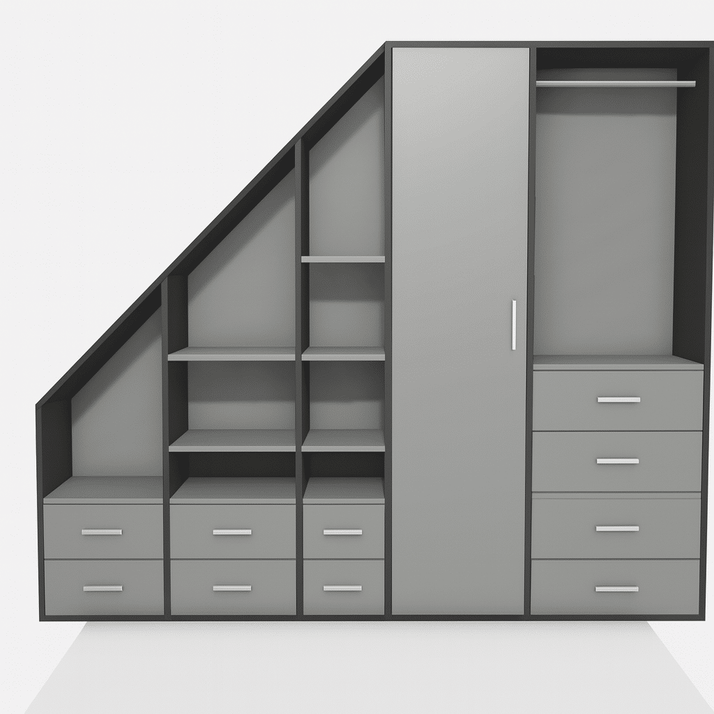 Affirmez le caractère de votre intérieur avec ce grand meuble sous pente moderne noir, conçu sur mesure par Tikimob. Spécialement pensé pour exploiter les espaces inclinés (combles, escaliers, murs en pente), il offre une solution de rangement élégante et contemporaine. Son coloris noir profond apporte du contraste et de la sophistication à votre pièce, tout en proposant des rangements fonctionnels et sur mesure.