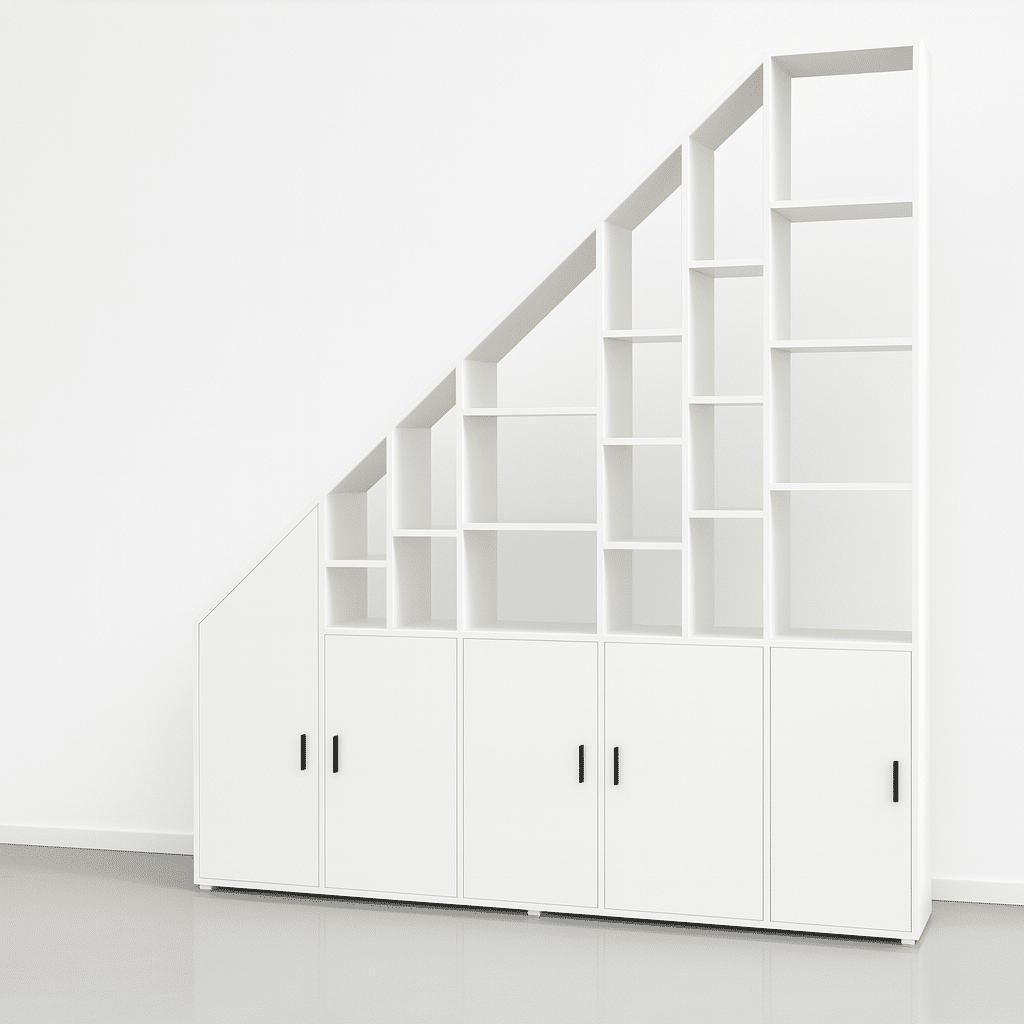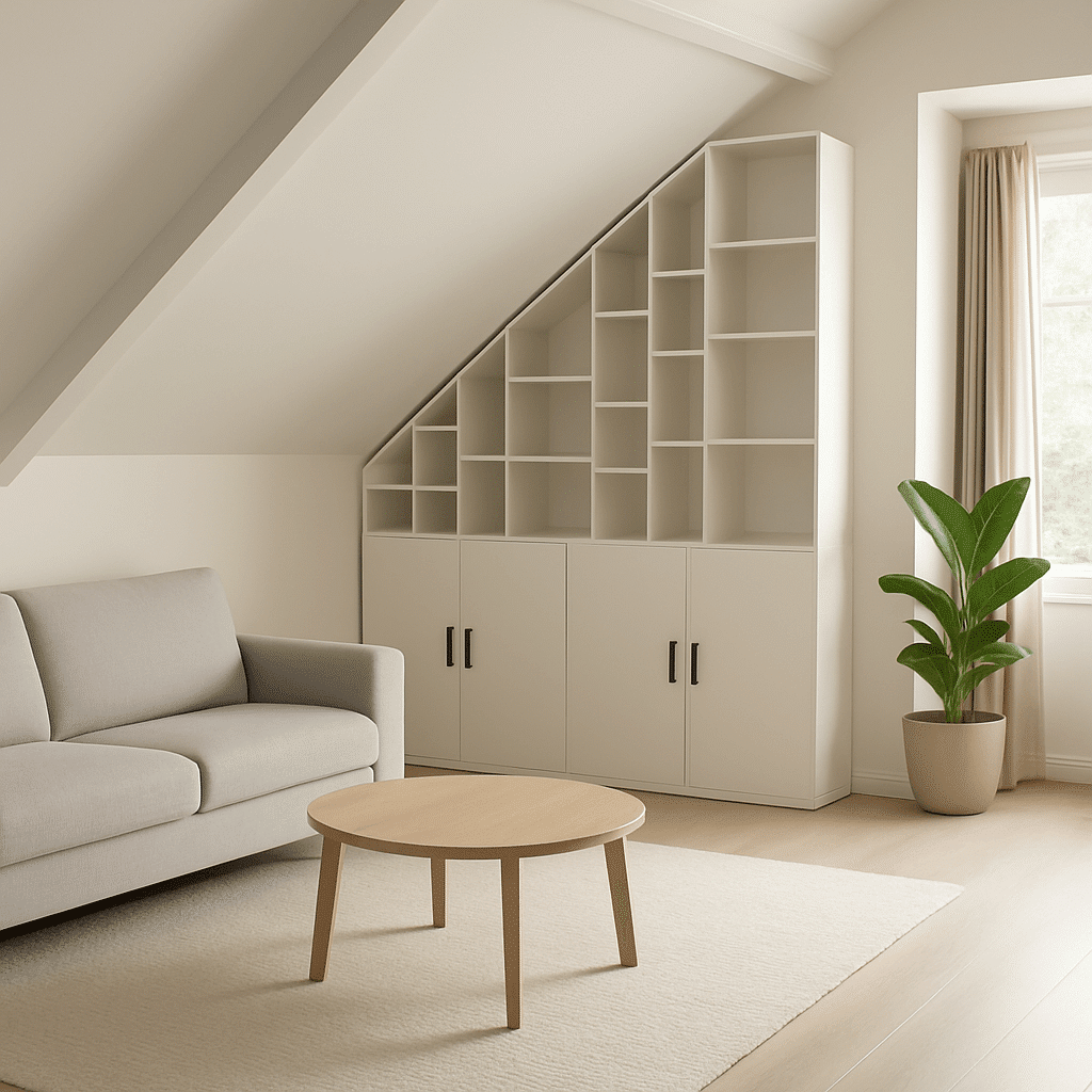 Optimisez vos espaces difficiles avec élégance grâce à ce meuble sous pente blanc moderne conçu sur mesure par Tikimob. Pensé pour s’intégrer parfaitement aux combles, sous-escaliers ou murs en pente, il offre un design épuré et contemporain. Son blanc lumineux agrandit visuellement la pièce tout en mettant en valeur des rangements sur mesure parfaitement pensés : tiroirs, niches, placards ou penderie.