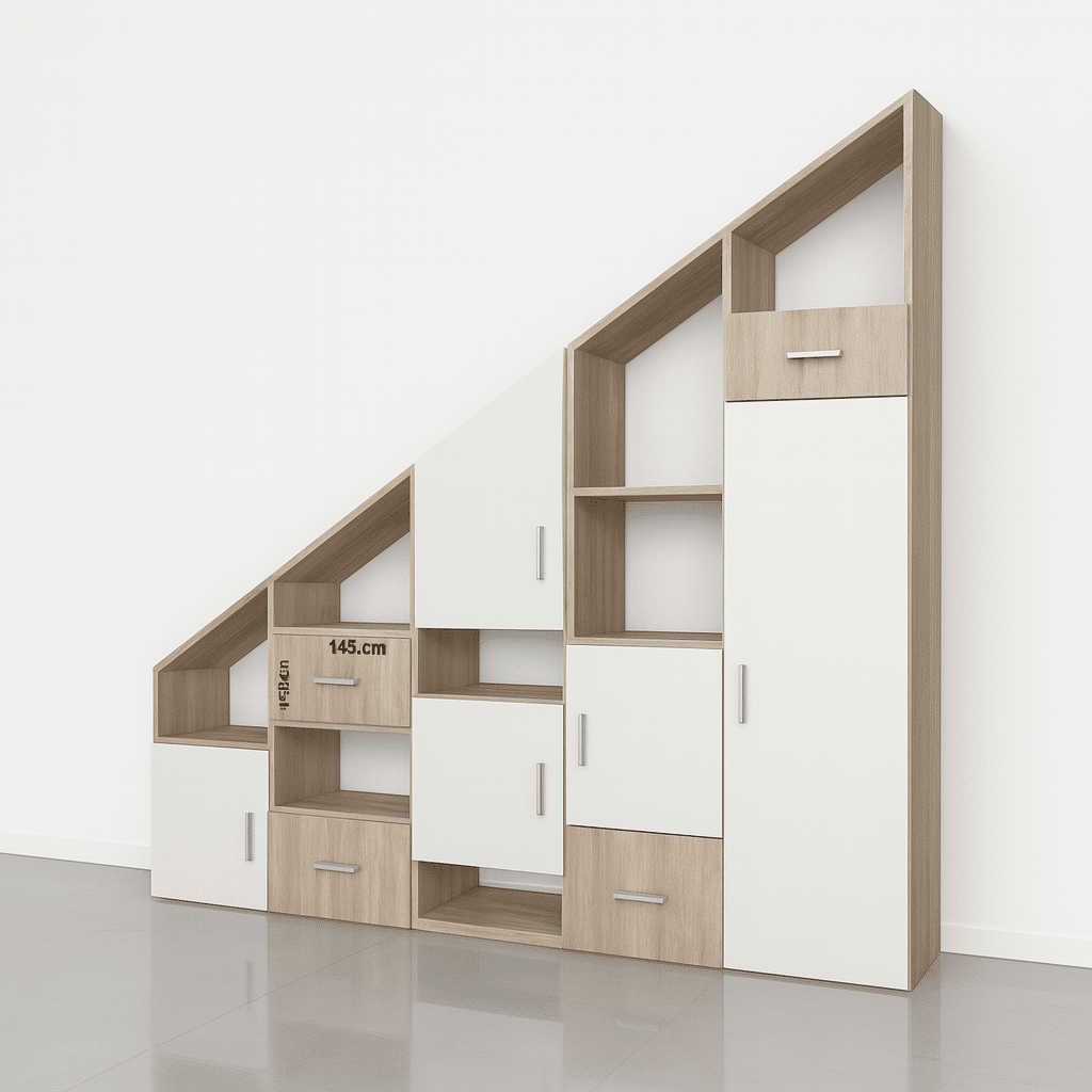 Apportez fonctionnalité et élégance à vos espaces perdus avec ce meuble sous pente blanc au style scandinave, réalisé sur mesure par Tikimob. Pensé pour s’adapter parfaitement aux murs inclinés, combles ou sous-escaliers, il associe lignes épurées, teintes claires et rangements intelligents. Sa finition blanche mate, typique du style nordique, illumine votre pièce tout en offrant une solution de rangement harmonieuse et pratique.