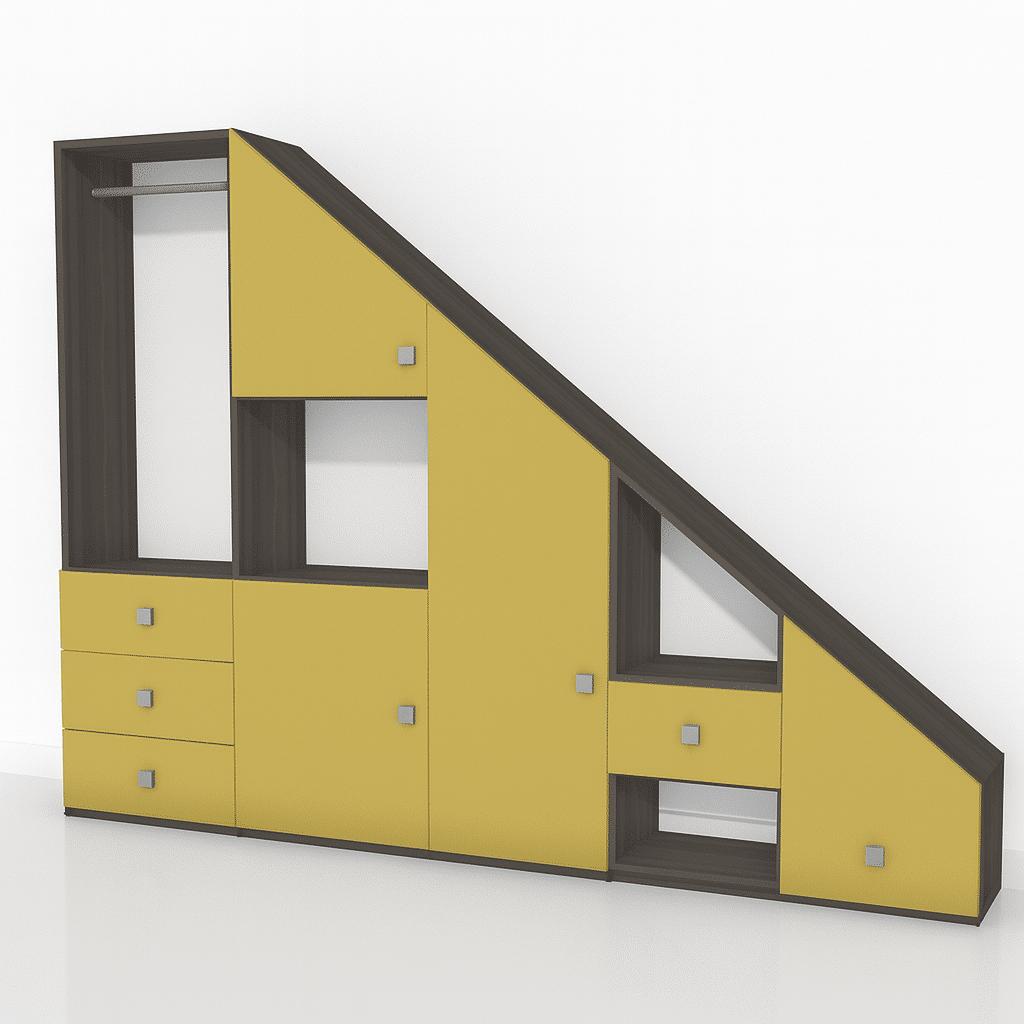 Faites rayonner vos espaces inutilisés avec ce meuble sous pente jaune, conçu sur mesure par Tikimob. Idéal pour les combles, les escaliers ou les murs inclinés, il combine parfaitement praticité et esthétique. Sa teinte jaune apporte une touche de gaieté et de modernité, tout en s’adaptant aux dimensions exactes de votre pièce. Une solution de rangement unique, colorée et parfaitement intégrée à votre intérieur.