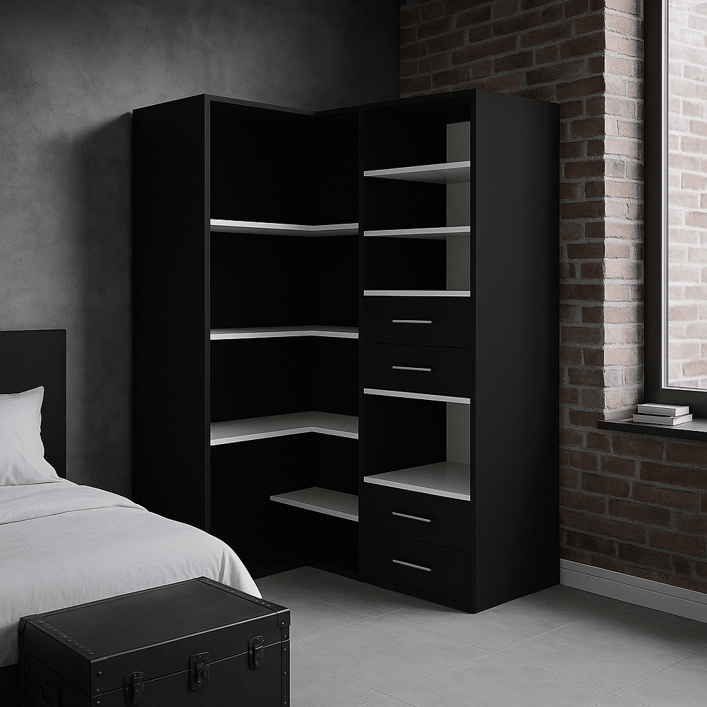 Optimisez l’agencement de vos pièces avec ce meuble d’angle moderne sur mesure avec penderie, pensé pour concilier style contemporain et gain de place. Conçu par Tikimob, il s’intègre parfaitement dans une chambre, un dressing ou une entrée grâce à ses lignes épurées, sa modularité et son design minimaliste.